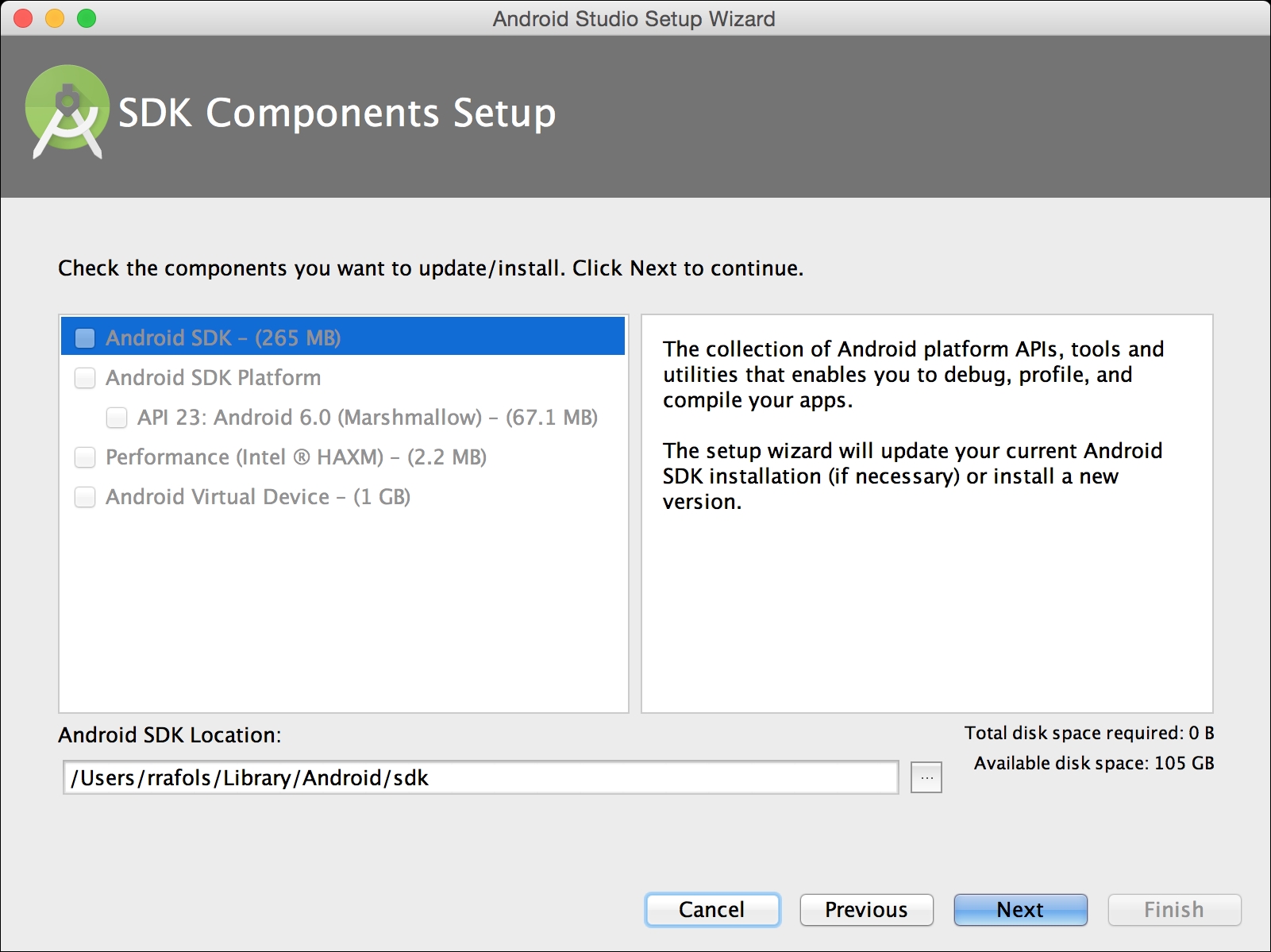 On Mac OS, Android SDK will be installed inside your local Library directory, as ~/Library/Android/sdk/.