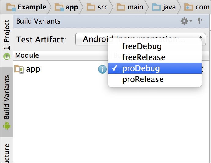 }We can choose which flavor to build from the Build Variants tab in Android Studio.
