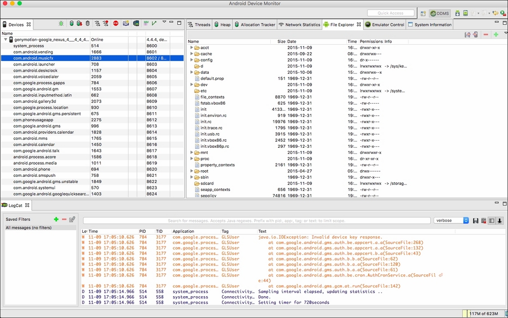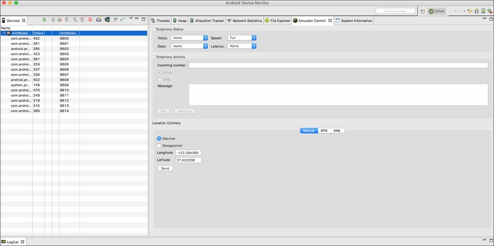 Dalvik Debug Monitor Server is also known as DDMS. This utility runs on top of adb, and provides a graphical interface with a big set of functionalities, including thread and heap information, logcat, SMS/call simulation, location data, and more. This is how DDMS looks when it starts: