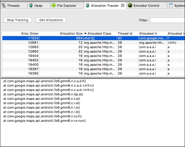The allocation tracker is a tool provided by Android that records an app's memory allocations and lists all allocated objects for the profiling cycle with their call stack, size, and allocating code. This goes further than the memory heap and allows us to identify individual pieces of memory being created. It is good to identify places in the code that might be allocating memory inefficiently and to identify objects of the same type that are being allocated and deallocated over a short period of time.