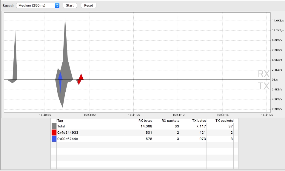 The bottom of the screen displays the network information by Tag, and collected by Total. It is possible to see the number of bytes and packages being sent and received in total, as well as a graphical representation of them.